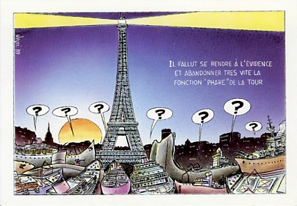 Levallois-Perret 1889-1989 : Centenaire de la Tour Eiffel. Il fallut se rendre à l’évidence et abandonner très vite la fonction ’phare’ de la Tour. Création Bernard VEYRI. Ed. Club des Créateurs et Cartophiles Contemporains, CPM d’une série M24/37
